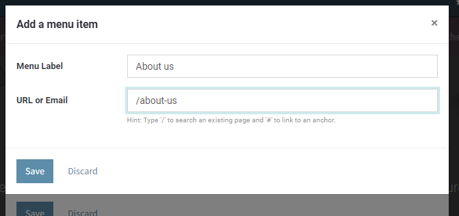6) Enter menu label (menu name) URL. [Here you need to set this page URL e.g. "About us" page URL could be www.xyz.com/about-us, here you need to enter /about-us ].