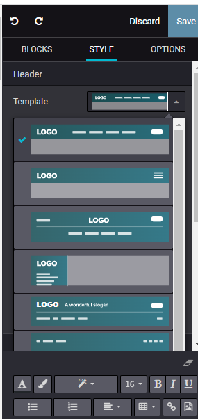 5) Click on any place of header and in the right side, from " Style " section, you will see template option. From the dropdown select your favorite header.